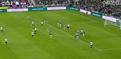 纽卡2-1伯恩利,吉马良斯角球破门,戈登点射建功
