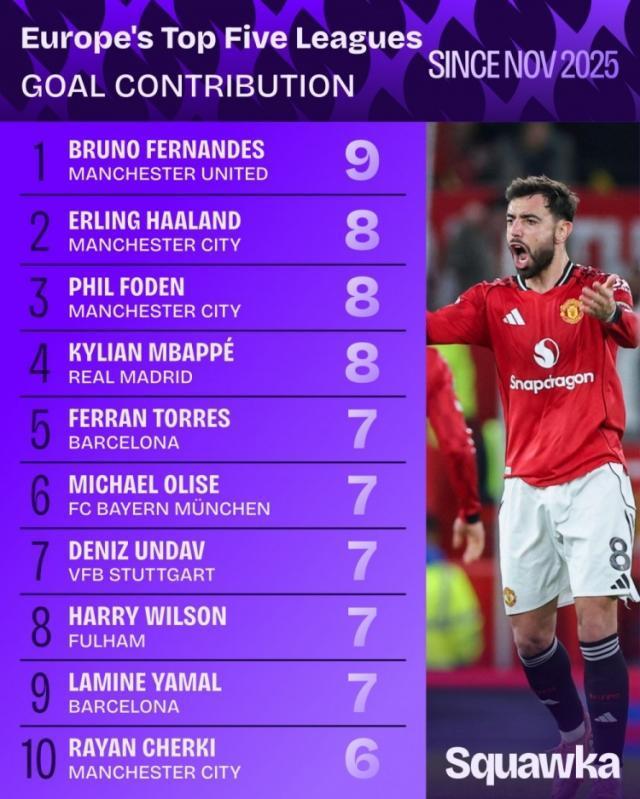 英超第16轮比赛,B费传射建功,曼联主场4比4战平伯恩茅斯。据Squawka统计,B费今年11月以来联赛参与9粒进球,五大联赛同期参与进球最多。今年11月以来五大联赛参与进球排名:
